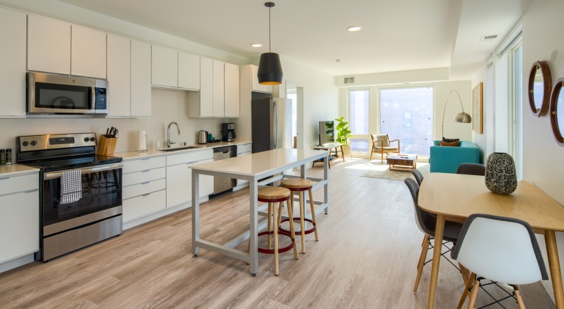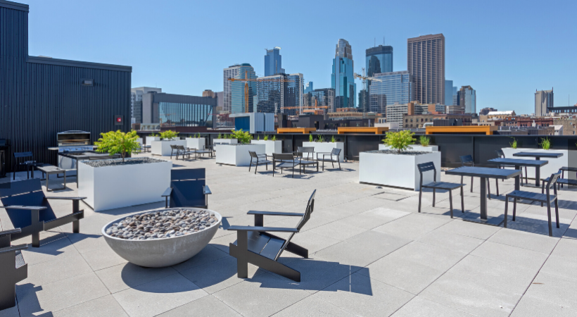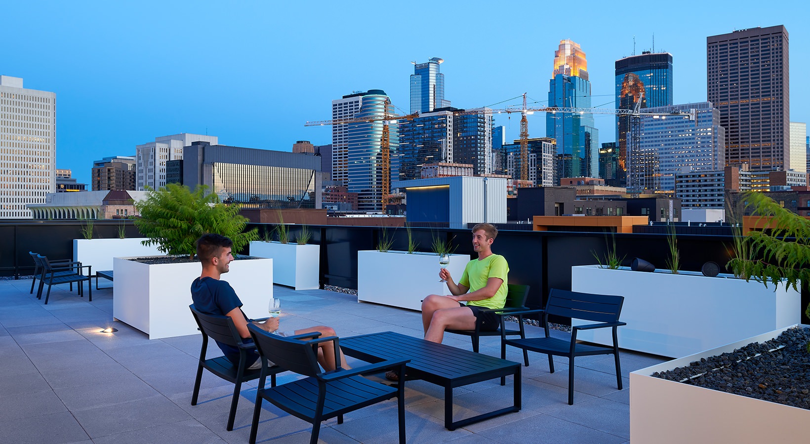 The Sky Lounge is the perfect spot to lounge around and watch the game on the big screen or host a friend’s dinner will full-size dining table and full kitchen with cooktop + microwave. Walk outside to the Sky Deck and enjoy the beautiful MN outdoors from home. Introducing outdoor grilling, fire pits for staying cozy in the evenings, and lounge chaises to soak in that summer sun all while taking in breathtaking views of downtown Minneapolis.